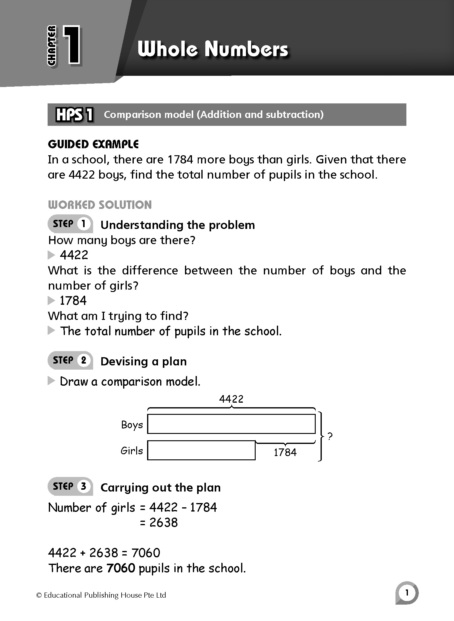 Guided examples in the books employ the 4-step problem-solving approach to give pupils a framework or structure in tackling word problems.